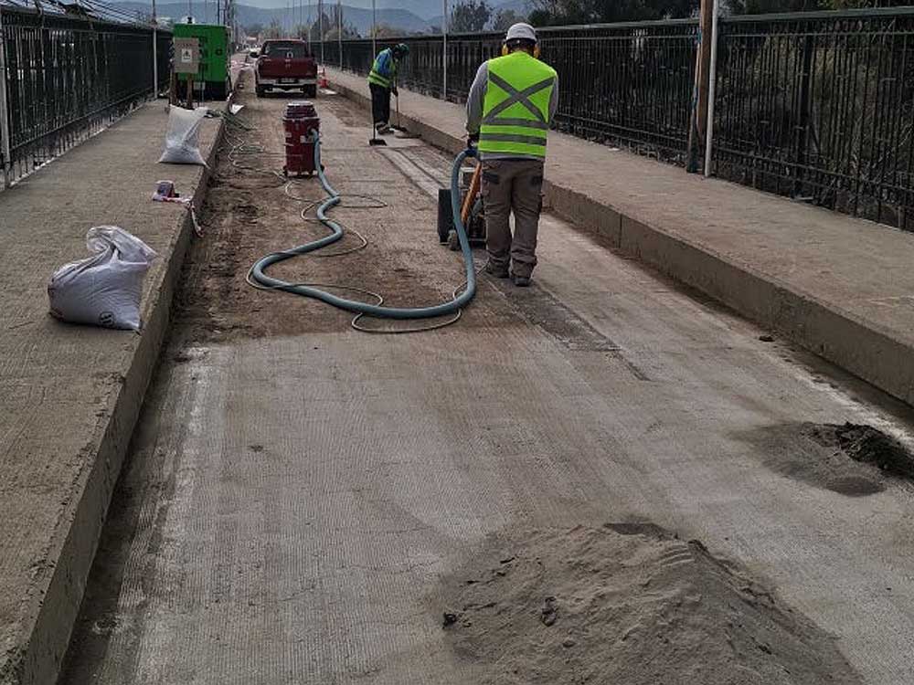 Destaca el proceso de escarificado superior de toda la losa del puente y la aplicación de un sellante impermeable de bajo espesor y alta resistencia, certificado en terreno realizando ensayos de adherencia, impermeabilización y resistencia a la fricción.